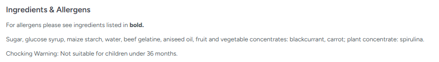 Sugar, glucose syrup, maize starch, water, beef gelatine, aniseed oil, fruit and vegetable concentrates: blackcurrant, carrot; plant concentrate: spirulina.