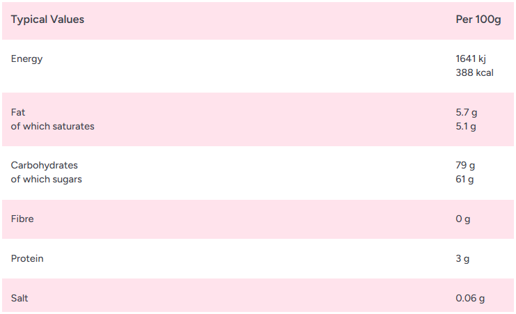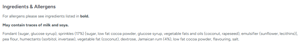 Fondant (sugar, glucose syrup), sprinkles (17%) [sugar, low fat cocoa powder, glucose syrup, vegetable fats and oils (coconut, rapeseed), emulsifier (sunflower, lecithins)], pea flower, humectants (sorbitol, invertase), vegetable fat (coconut), dextrose, rum (3%), low fat cocoa powder, flavouring, salt.