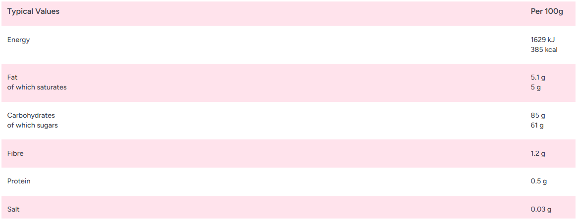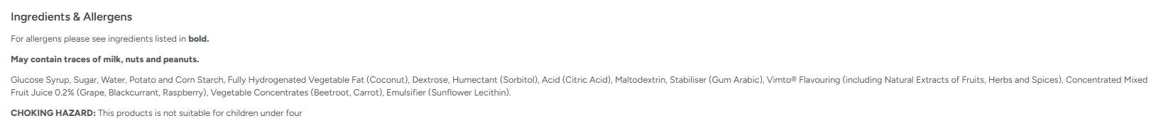 Glucose Syrup, Sugar, Water, Potato and Corn Starch, Fully Hydrogenated Vegetable Fat (Coconut), Dextrose, Humectant (Sorbitol), Acid (Citric Acid), Maltodextrin, Stabiliser (Gum Arabic), Vimto® Flavouring (Including Natural Extracts of Fruits, Herbs and Spices), Concentrated Mixed Fruit Juice 0.2% (Grape, Blackcurrant, Raspberry), Vegetable Concentrates (Beetroot, Carrot), Emulsifier (Mono- and diglycerides of fatty acids)