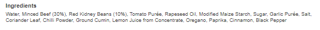 Water, Minced Beef (30%), Red Kidney Beans (10%), Tomato Purée, Rapeseed Oil, Modified Maize Starch, Sugar, Garlic Purée, Salt, Coriander Leaf, Chilli Powder, Ground Cumin, Lemon Juice from Concentrate, Oregano, Paprika, Cinnamon, Black Pepper
