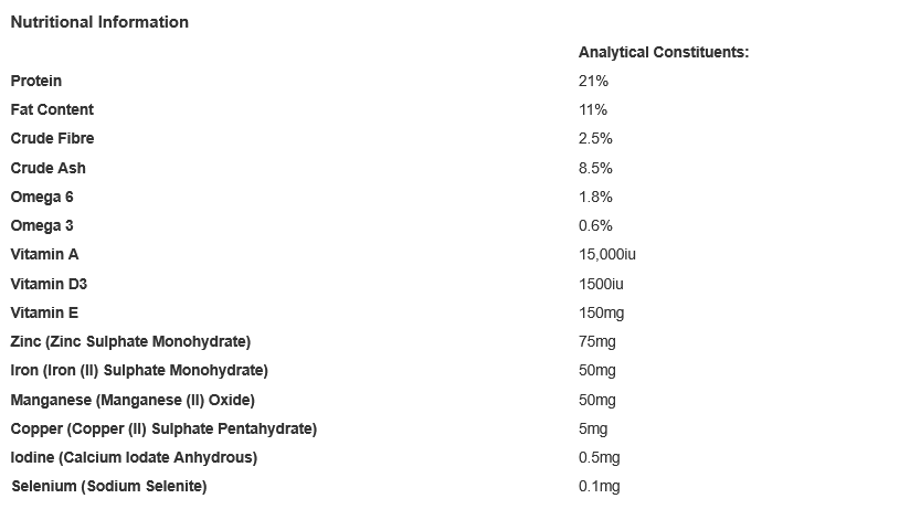 Lamb & Meat Meals 28% (including, Dried Lamb 7%* & Freshly prepared Chicken 4%), Maize, Barley, Oats (10%), Rice (5.6%), Chicken Fat (3%), Omega Blend (Salmon oil, Vegetable oil & Linseed 1.8%), Minerals, Seaweed (1000mg/kg), FOS (1000mg/kg), Yucca Extract (100mg/kg)