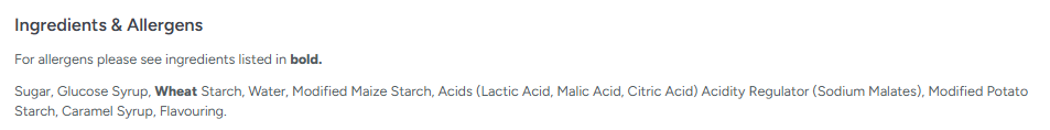 Sugar, Glucose Syrup, Wheat Starch, Water, Modified Maize Starch, Acids (Lactic Acid, Malic Acid, Citric Acid) Acidity Regulator (Sodium Malates), Modified Potato Starch, Caramel Syrup, Flavouring.