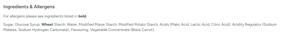 Sugar, Glucose Syrup, Wheat Starch, Water, Modified Maize Starch, Modified Potato Starch, Acids (Malic Acid, Lactic Acid, Citric Acid), Acidity Regulator (Sodium Malates, Sodium Hydrogen Carbonate), Flavouring, Vegetable Concentrate (Black Carrot).