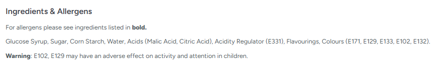 Sugar, glucose syrup, glucose and fructose syrup, gelatine (beef, pork), water, acids (E330, E296, E270), wheat flour, acidity regulators (E350, E325, E331), maize starch, flavourings, vegetable fat (palm), humectant (E422), vegetable, fruit and plant concentrates (carrot, blackcurrant, safflower), colours (E120, E133, E160c, E150d, E163), salt, emulsifier (E471).
