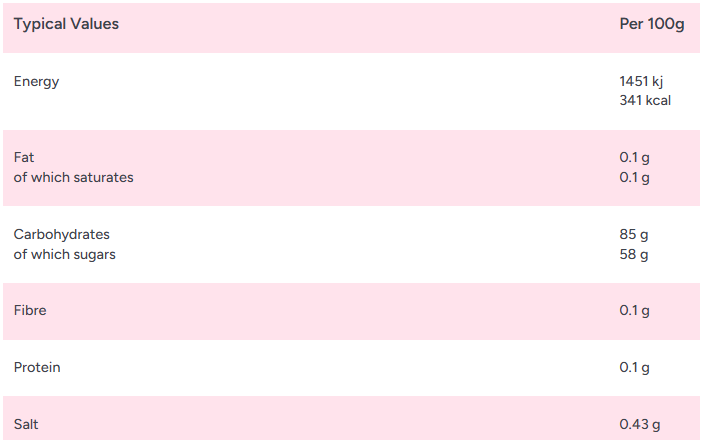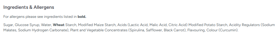 Sugar, Glucose Syrup, Water, Wheat Starch, Modified Maize Starch, Acids (Lactic Acid, Malic Acid, Citric Acid) Modified Potato Starch, Acidity Regulators (Sodium Malates, Sodium Hydrogen Carbonate), Plant and Vegetable Concentrates (Spirulina, Safflower, Black Carrot), Flavouring, Colour (Curcumin).