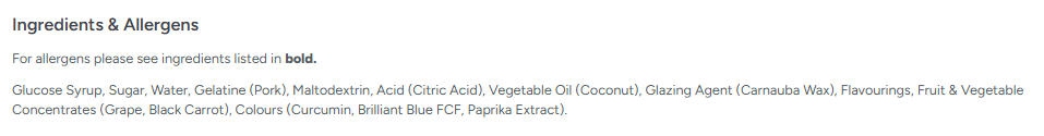 Glucose Syrup, Sugar, Water, Gelatine (Pork), Maltodextrin, Acid (Citric Acid), Vegetable Oil (Coconut), Glazing Agent (Carnauba Wax), Flavourings, Fruit & Vegetable Concentrates (Grape, Black Carrot), Colours (Curcumin, Brilliant Blue FCF, Paprika Extract).