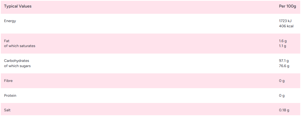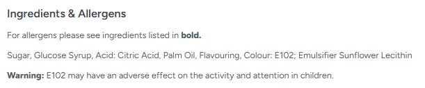 Sugar, glucose syrup, acid: citric acid; flavouring, colour: E104.