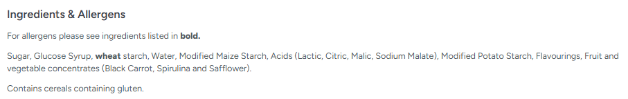 Sugar, Glucose Syrup, wheat starch, Water, Modified Maize Starch, Acids (Lactic, Citric, Malic, Sodium Malate), Modified Potato Starch, Flavourings, Fruit and vegetable concentrates (Black Carrot, Spirulina and Safflower).