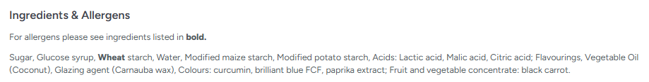 Sugar, Glucose syrup, Wheat starch, Water, Modified maize starch, Modified potato starch, Acids: Lactic acid, Malic acid, Citric acid; Flavourings, Vegetable Oil (Coconut), Glazing agent (Carnauba wax), Colours: curcumin, brilliant blue FCF, paprika extract; Fruit and vegetable concentrate: black carrot.