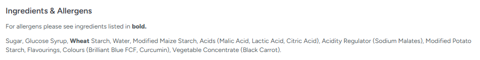 Sugar, Glucose Syrup, Wheat Starch, Water, Modified Maize Starch, Acids (Malic Acid, Lactic Acid, Citric Acid), Acidity Regulator (Sodium Malates), Modified Potato Starch, Flavourings, Colours (Brilliant Blue FCF, Curcumin), Vegetable Concentrate (Black Carrot).