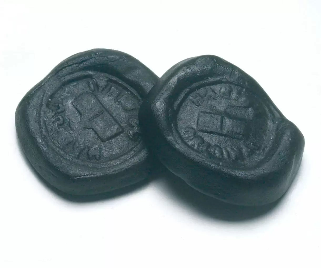 Haribo Pontefract Cakes are a popular retro sweet. Round liquorice flavoured jellies that are black in colour.