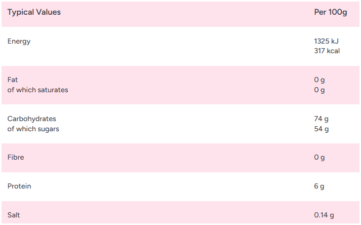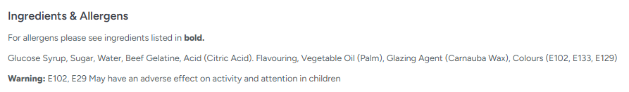 Glucose Syrup*, Sugar, Water, Beef Gelatine, Corn Starch, Acid (Citric Acid), Vegetable Oil (Palm Oil), Glazing Agent (E903), Flavouring, Acidity Regulator (Sodium Citrate), Colours (E129, E102, E133).