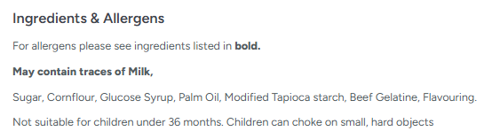 Sugar, Cornflour, Glucose Syrup, Palm Oil, Modified Tapioca starch, Beef Gelatine, Flavouring.