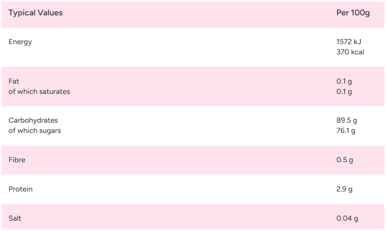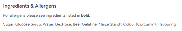 Sugar, Glucose Syrup, Water, Dextrose, Beef Gelatine, Maize Starch, Colour (Curcumin), Flavouring.