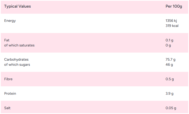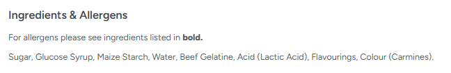 Sugar, Glucose Syrup, Cornflour, Water, Beef Gelatine, Acid (Lactic Acid), Flavourings, Colour (Carmines).