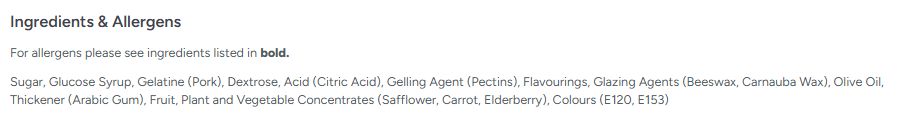 Sugar, Glucose Syrup, Pork Gelatine, Dextrose, Acid (Citric Acid), Gelling Agents(Pectins), Flavourings, Glazing Agents (Beeswax, Carnauba Wax), Olive oil, Vegetable Oils (Palm,Palm Kernel), Thickening Agent (Arabic Gum), Fruit, Plant and Vegetable Concentrates (Lemon,Safflower, Elderberry, Carrot),Colours (E120, E153).