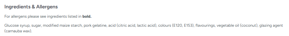 Glucose syrup, sugar, modified maize starch, pork gelatine, acid (citric acid, lactic acid), colours (E120, E153), flavourings, vegetable oil (coconut), glazing agent (carnauba wax).