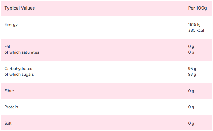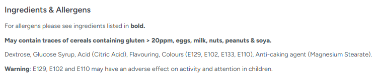 Dextrose, Glucose Syrup, Acidity Regulator (Citric Acid), Flavouring, Colours (E129, E102, E133, E110), Anti-caking agent (Magnesium Stearate)