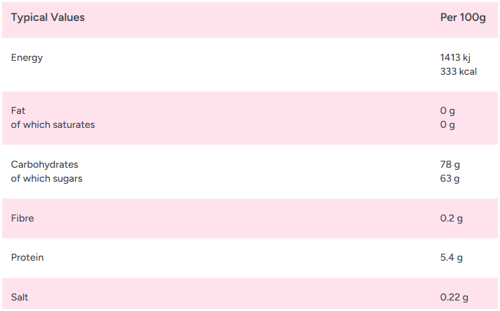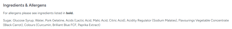 Sugar, Glucose Syrup, Water, Pork Gelatine, Acids (Lactic Acid, Malic Acid, Citric Acid), Acidity Regulator (Sodium Malates), Flavourings Vegetable Concentrate (Black Carrot), Colours (Curcumin, Brilliant Blue FCF, Paprika Extract)