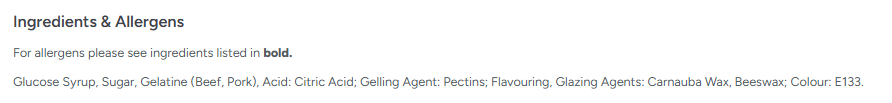 Glucose syrup, Sugar, Gelatine (Pork & Beef), Acid (Citric Acid), Gelling Agent (Pectin), Flavourings, Vegetable Oils (Palm), Glazing Agents (Carnauba wax, Beeswax), Colour (E133).