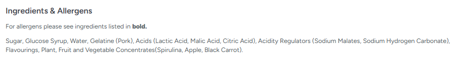 Sugar, Glucose Syrup, Water, Gelatine (Pork), Acids (Lactic Acid, Malic Acid, Citric Acid), Acidity Regulators (Sodium Malates, Sodium Hydrogen Carbonate), Flavourings, Plant, Fruit and Vegetable Concentrates(Spirulina, Apple, Black Carrot).