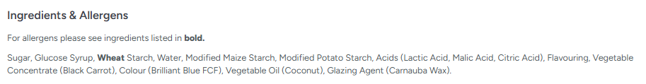 Sugar, Glucose Syrup, Wheat Starch, Water, Modified Maize Starch, Modified Potato Starch, Acids (Lactic Acid, Malic Acid, Citric Acid), Flavouring, Vegetable Concentrate (Black Carrot), Colour (Brilliant Blue FCF), Vegetable Oil (Coconut), Glazing Agent (Carnauba Wax).