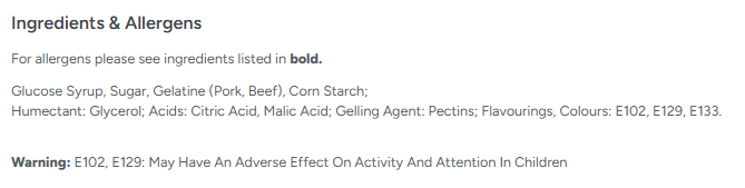Humectant: Glycerol; Acids: Citric Acid, Malic Acid; Gelling Agent: Pectins; Flavourings, Colours: E102, E129, E133.