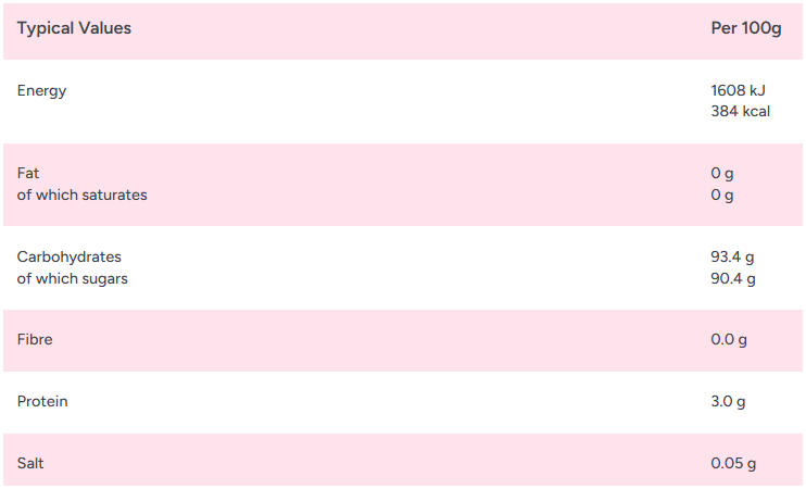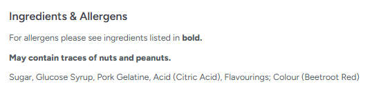 Sugar, Glucose Syrup, Water, Dextrose, Beef Gelatine, Cornflour, Colour (Beetroot Red), Flavouring.