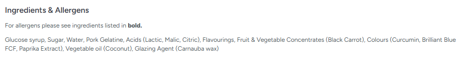 Glucose syrup, Sugar, Water, Pork Gelatine, Acids (Lactic, Malic, Citric), Flavourings, Fruit & Vegetable Concentrates (Black Carrot), Colours (Curcumin, Brilliant Blue FCF, Paprika Extract), Vegetable oil (Coconut), Glazing Agent (Carnauba wax)