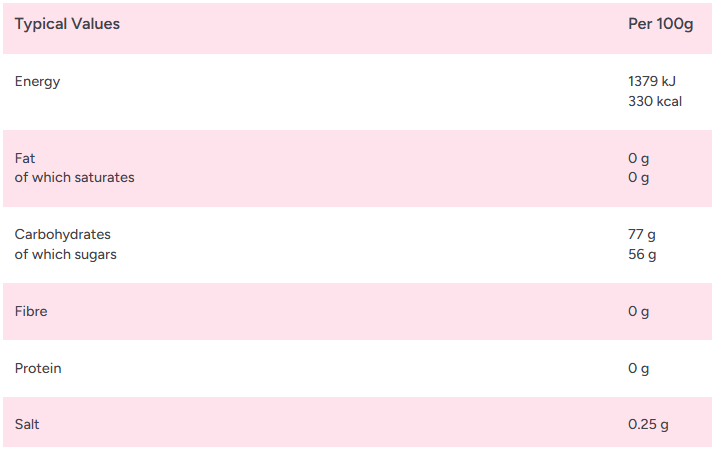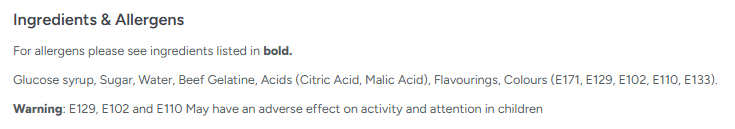 Glucose Syrup, Sugar, Modified Starch (Maize, Wheat, Potato), Acids (Citric Acid, Lactic Acid, Malic Acid), Acidity Regulator (Sodium Malates), Colours (E100, E133, E141, E160c), Vegetable Extract (Black Carrot), Flavourings, Glazing Agent (Carnauba Wax).