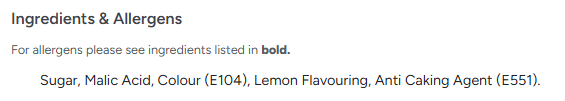 • Sugar, Malic Acid, Colour (E104), Lemon Flavouring, Anti Caking Agent (E551).