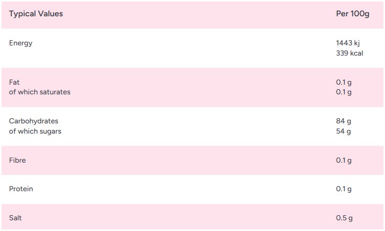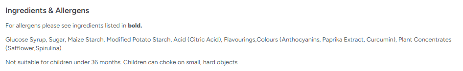 Glucose Syrup, Sugar, Maize Starch, Modified Potato Starch, Acid (Citric Acid), Flavourings,Colours (Anthocyanins, Paprika Extract, Curcumin), Plant Concentrates (Safflower,Spirulina).