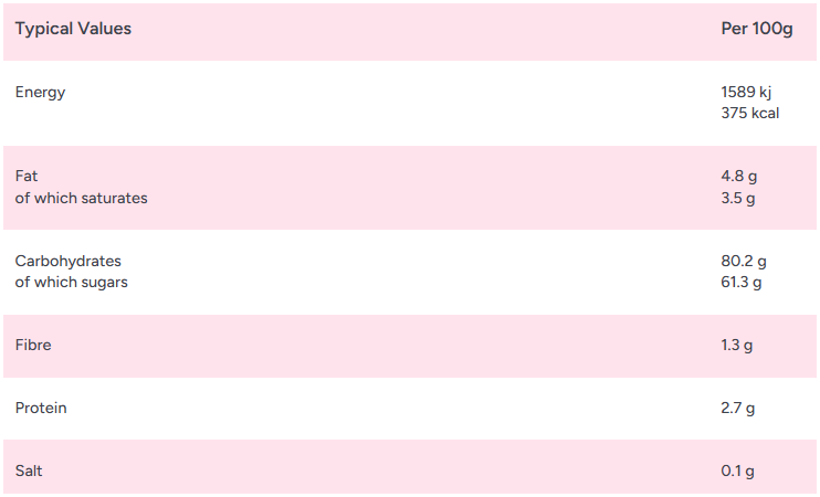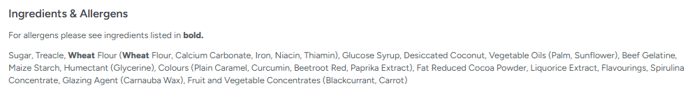 Sugar, Treacle, Wheat Flour (Wheat flour, Calcium Carbonate, Iron, Niacin, Thiamine), Glucose Syrup, Desiccated Coconut, Vegetable Oils (Palm Oil, Coconut Oil, Sunflower Oil), Beef Gelatine, Cornflour, Humectant (Glycerol), Natural Colours (Plain Caramel, Curcumin, Beetroot Red, Paprika Extract), Fat Reduced Cocoa Powder, Liquorice Extract, Glazing Agent (Beeswax, Carnauba Wax), Flavourings, Spirulina Concentrate, Fruit and Vegetable Concentrates (Blackcurrant, Carrot).