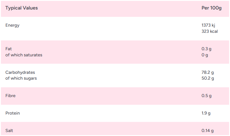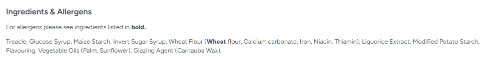 Treacle, Glucose Syrup, Maize Starch, Invert Sugar Syrup, Wheat Flour (Wheat flour, Calcium carbonate, Iron, Niacin, Thiamin), Liquorice Extract, Modified Potato Starch, Flavouring, Vegetable Oils (Palm, Sunflower), Glazing Agent (Carnauba Wax).