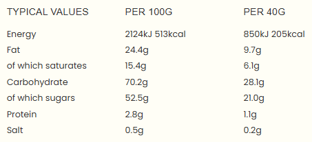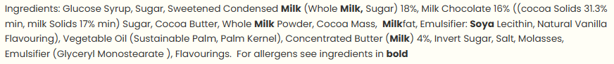 Glucose Syrup, Sugar, Sweetened Condensed Milk (from whole milk), Milk Chocolate 16% (Cocoa Solids, Milk Solids, Sugar, Cocoa butter, Whole milk powder, Cocoa mass, Milk fat, Emulsifier: Soya lecithin, Natural vanilla flavouring), Vegetable Oil (palm), Butter (Milk), Salt, Molasses, Emulsifier (E471), Flavourings.