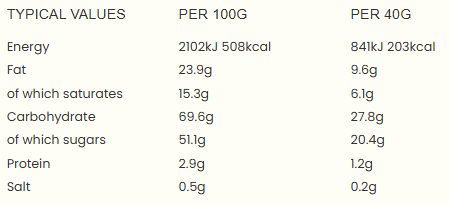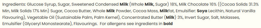 Glucose Syrup, Sugar, Sweetened Condensed Milk (from whole milk) 18%, Milk Chocolate 16% (sugar, cocoa butter, whole milk powder, cocoa mass, anhydrous milkfat, emulsifier: soya lecithin, natural vanilla flavouring), Vegetable Oil (sustainable palm oil), Concentrated Butter (milk) 3%, Salt, Molasses, Emulsifier (E471), Flavourings.